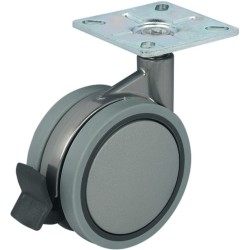 Klassiske møbelhjul i sølvfarget plast med monteringsplate. Disse hjul er spesielt godt egnet for stuemøbler og ikke for profesjonell bruk. Dette hjulet er styrbart og kommer med brems og monteringsplate.