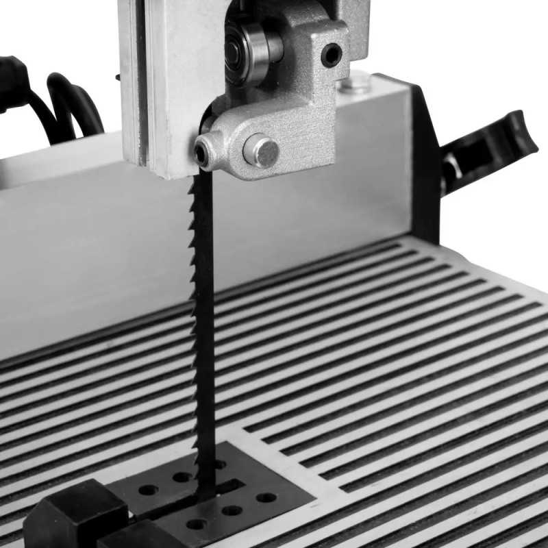 Denne båndsagen har aluminiumsruller og et robust metallhus. Den har derfor lang levetid.