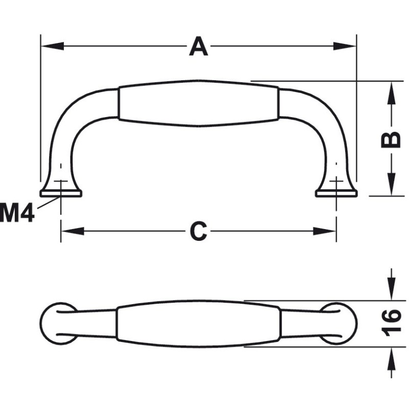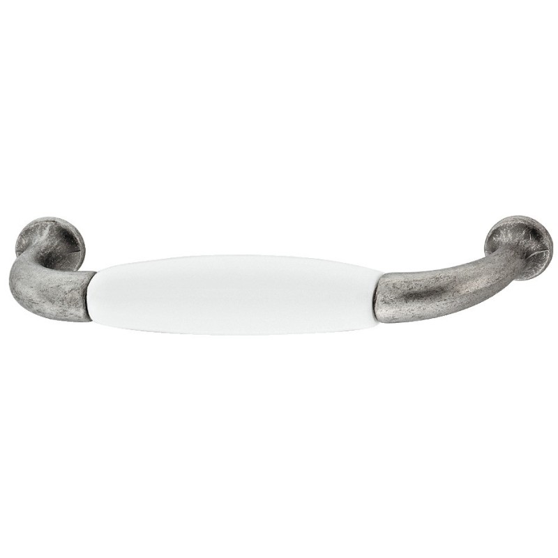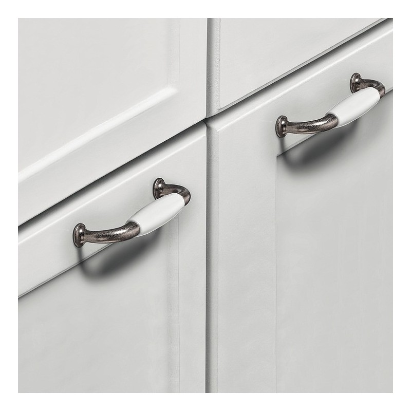 Hvitt porselen håndtak med forniklet antikk sokkel. Håndtaket har et unikt og gammeldags utseende som passer godt til et landlig kjøkken.
