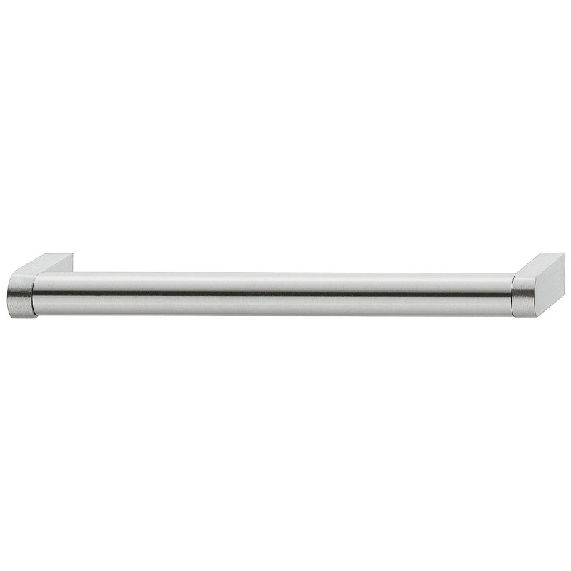 Enkelt møbelhåndtak med firkantet sokkel og rundt håndtak i rustfritt stål. Grepet har en matt børstet overflate og en diameter på Ø14 mm.