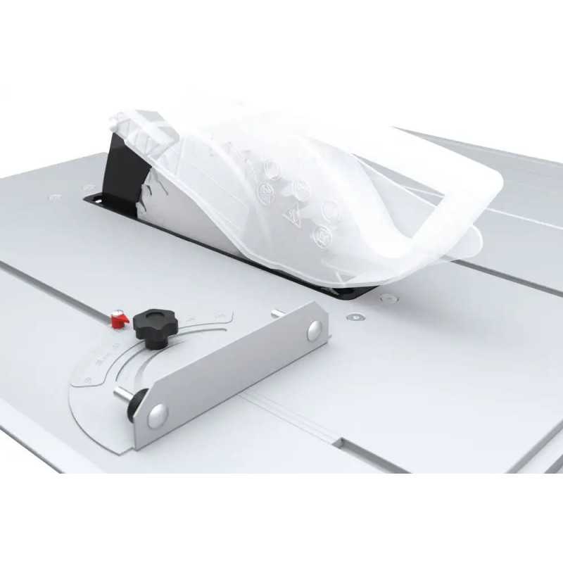 Den har styrestang, vinkel- og lengdekuttføring samt beskyttelsesplate mot sagbladet. I tillegg har den mulighet for tilkobling til støvsuger og to bordforlengere.