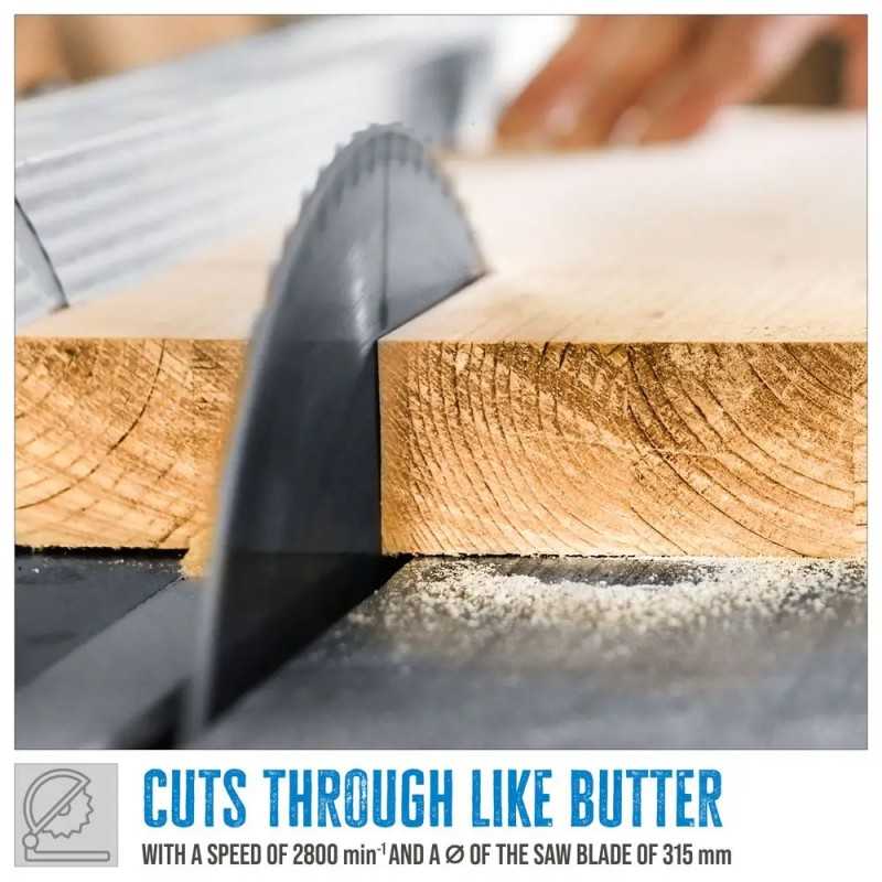Har styrepinne, vinkel- og lengdesnitt føring samt beskyttelsesplate mot sagbladet. I tillegg har den mulighet for tilkobling av utsugningsdyse med 100 mm diameter og en avtakbar bordforlengelse for de litt større prosjektene.