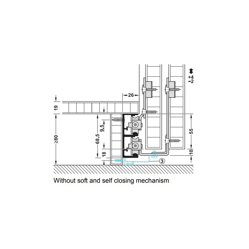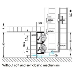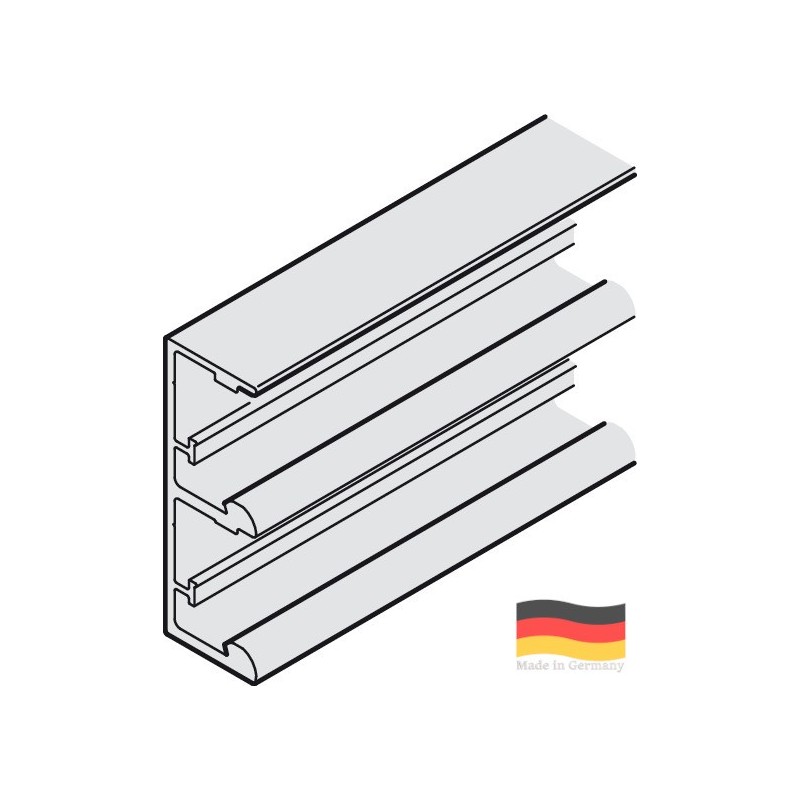 Dobbeltskinne til Hawa skyvedørbeslag i seriene MF og VF. Denne løpeskinnen brukes til versjonen av Hawa 50 H VF og MF hvis det IKKE skal legges til soft-close (lukking med demping).