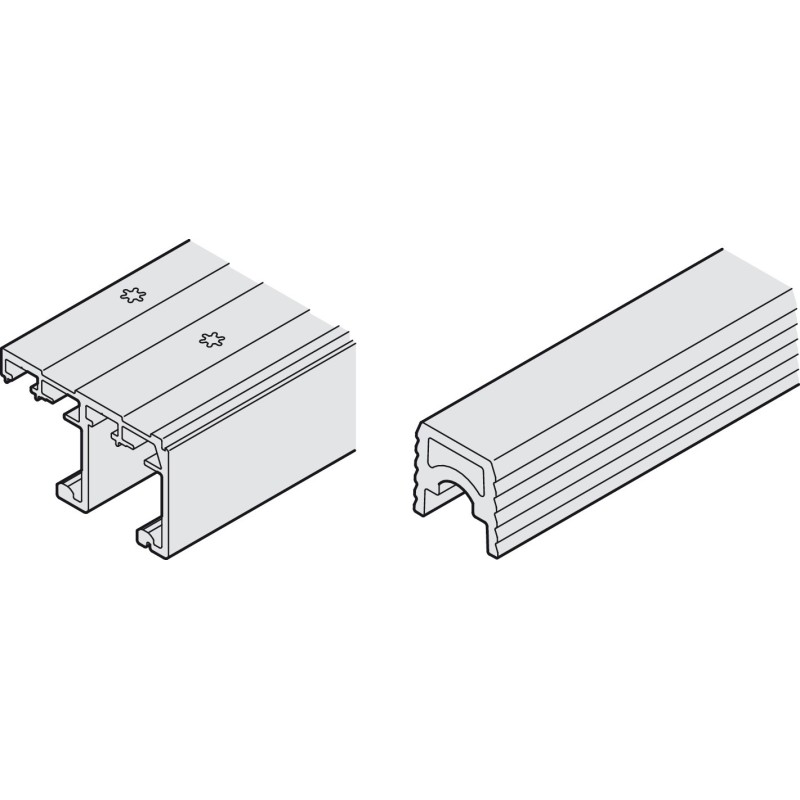 Dobbelt løbeskinne til Hawa skyvedørsbeslag 65 H IF. Styre- og løbeskinne er nødvendige for at skyvedørssystemet fungerer. Finn styreskinnen, enkelt løbeskinne og selve skyvedørsbeslaget i tilbehøret.