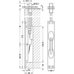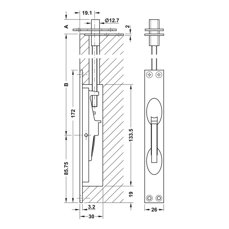 Denne modellen er beregnet for skjult montering i en tre- eller metaldør, og skal settes inn i en fræsning. Skudriglen låses lett ved å skyve tappen opp eller ned.