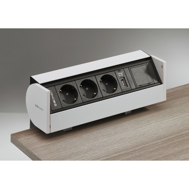 Med 3 Schuko-stikkontakter, 1 USB-lader 2A, 1 stikkmodul RJ45, 0,5 m strømkabel med SV 16-stikk.