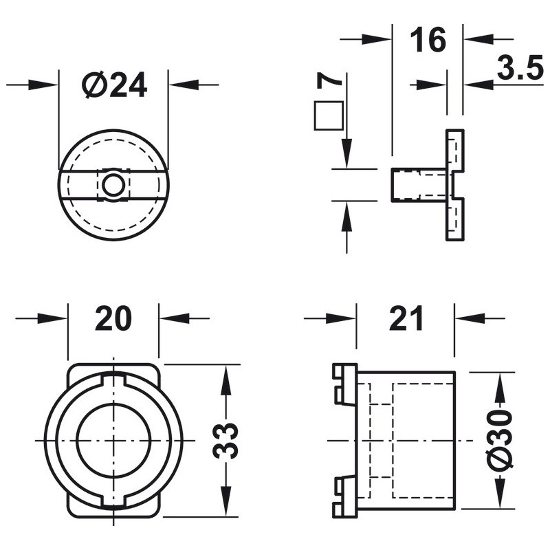 Brukes til å kombinere Piccolo-Nova og Standard-Nova espagnolette låser (uten låserosetter) med 7 mm firkantstift og til dreieknotthåndtak Ø30 mm.