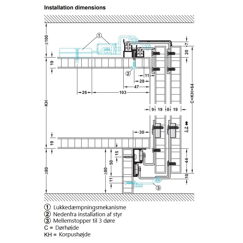 Mellomstopperen fungerer som en stoppekloss for den midterste døren i et 3-dørs system. Det vil si at den sørger for at den midterste døren beholder sin posisjon ved lukking, slik at man ikke må justere dørene manuelt.
