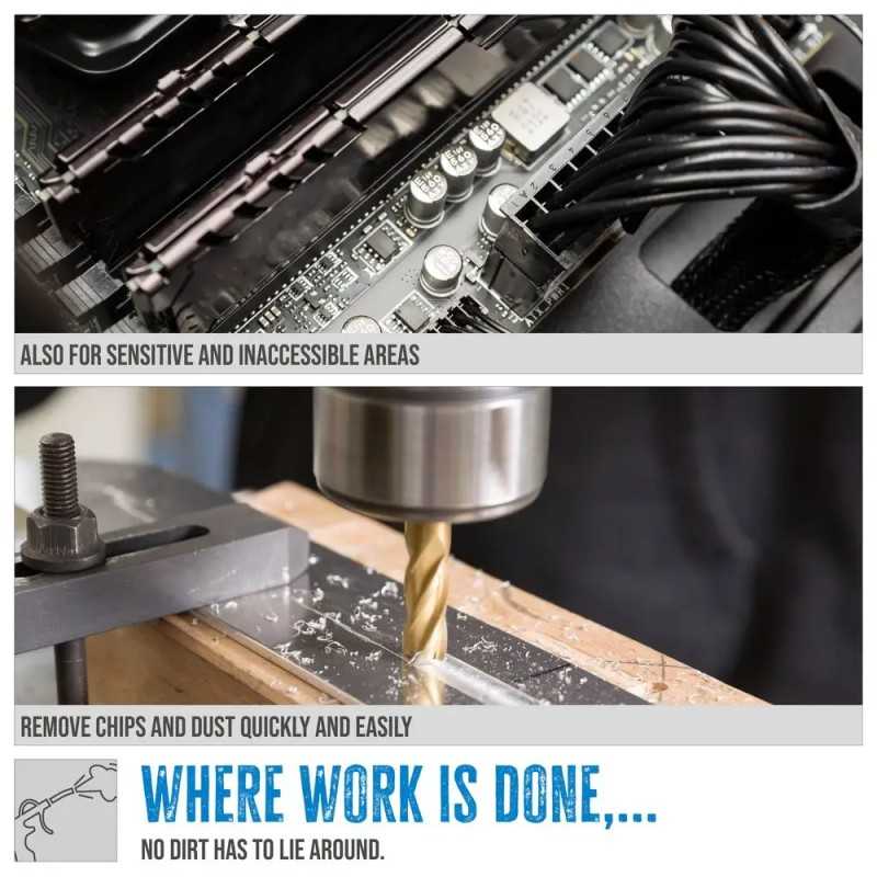 Trykkluftpistolens hus er laget av støpt aluminium. Denne modellen er ideell for å nå vanskelige steder.