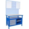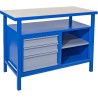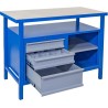 Arbeidsbenken har tre skuffer, hvorav de to liten skuffer kommer med skuffeinnsatser. Skuffene har en sylinderlås som låser alle tre skuffene samtidig. I tillegg har bordet et åpent rom med flyttbar hylle.