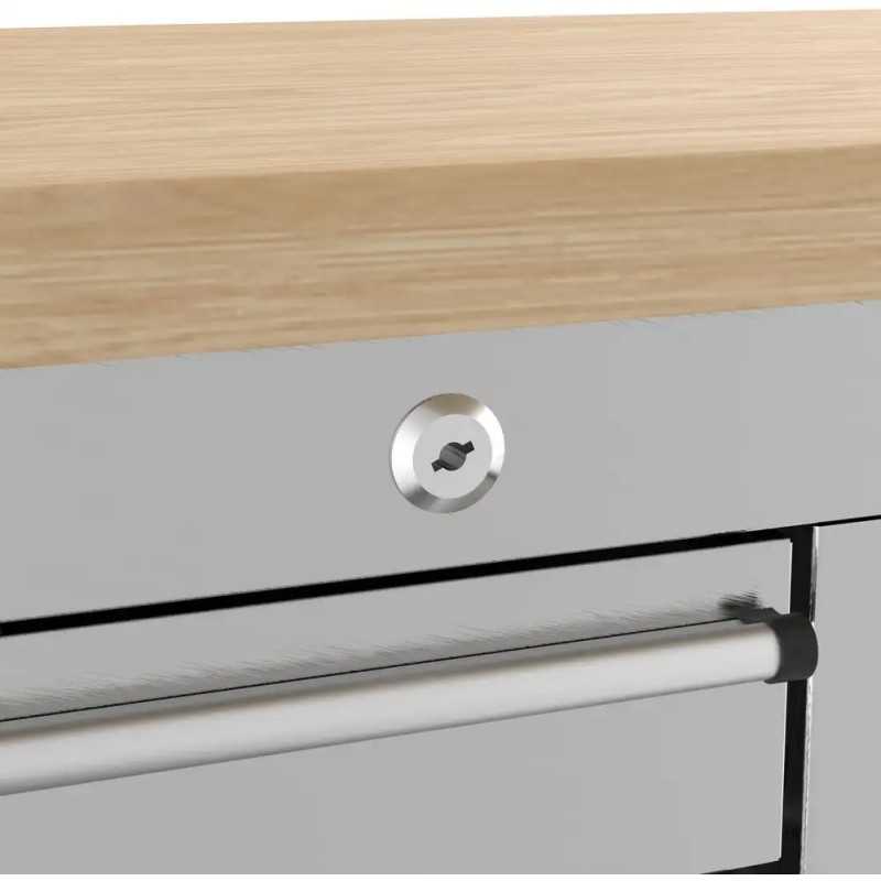 I tillegg har vognen fire hjul, hvorav to av de fire hjulene har brems, samt lås for både døren og alle 5 skuffene.