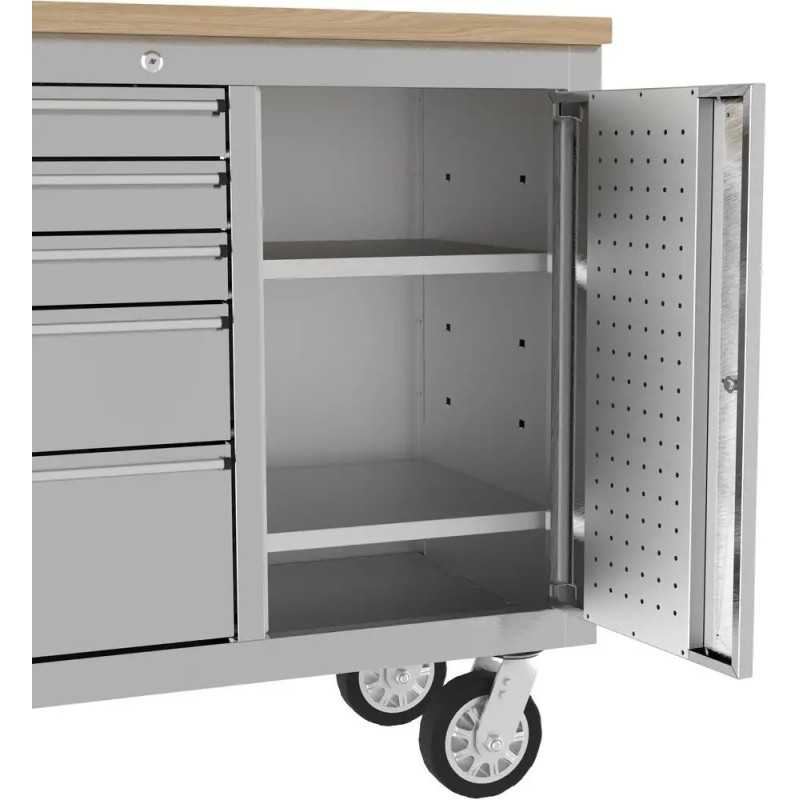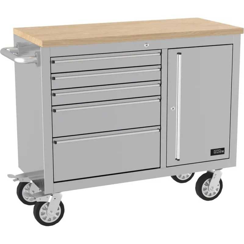 Güde verkstedvogn INOX GW 5/1 er en robust arbeidsstasjon av rustfritt stål med 5 skuffer, 1 rom med hyller, hjul og lås.
