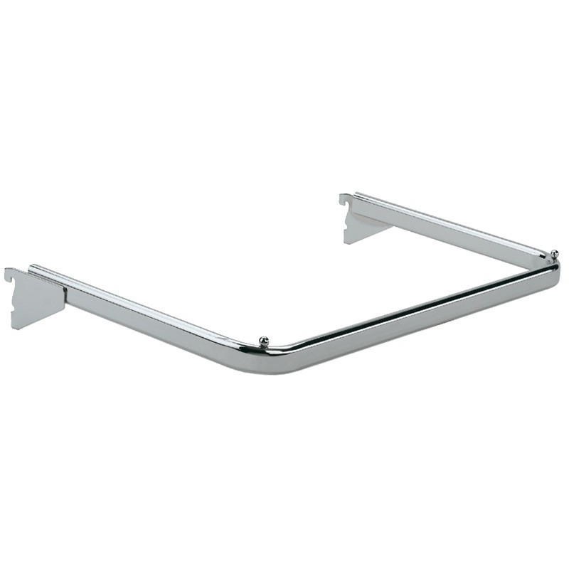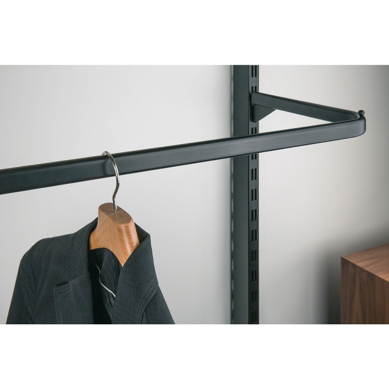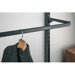 Firkantet bøjlestang til vårt smarte bygg-selv-reolsystem. Denne modellen kommer med 1 opphengskrok i hver side, og kan hektes direkte fast mellom 2 skinner eller søyler.