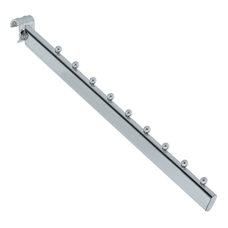 Skrå opphengsarm til vårt smarte bygg-selv-hyllesystem. Denne modellen er skrå og kommer med 9 kuler for opphenging av kleshengere.