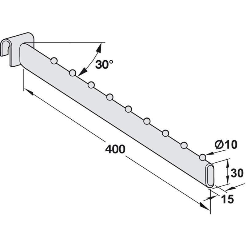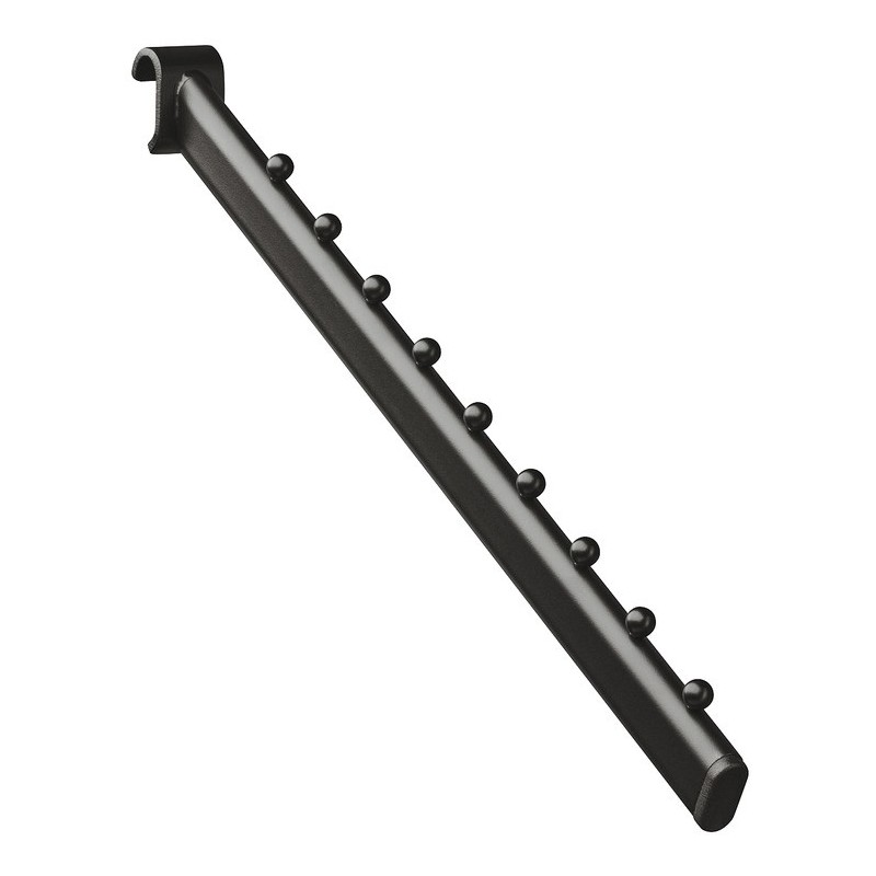 Skrå opphengsarm til vårt smarte bygg-selv-reolsystem. Denne modellen er skrå og kommer med 9 kuler for opphenging av kleshengere.