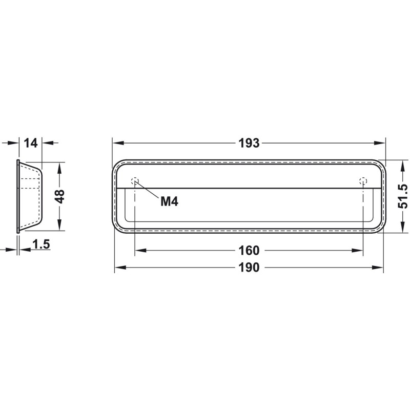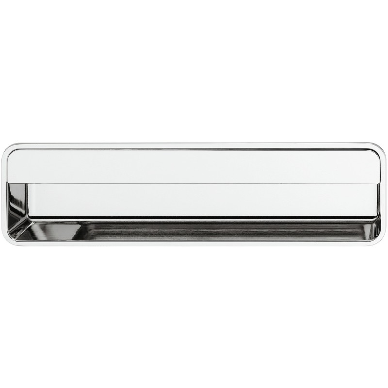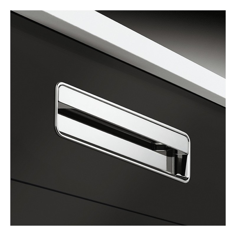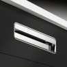 Rektangulær skålegreb i forkrommet polert zinklegering. Grepet har et enkelt og stilrent design med en liten skinne foran for bedre grep. Dette grepet er et sikkert valg hvis man leter etter et grep som kan inngå som en integrert del av sitt møbel.