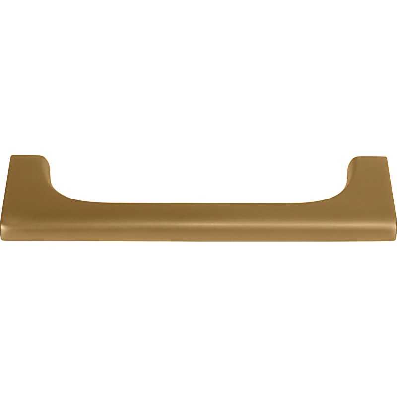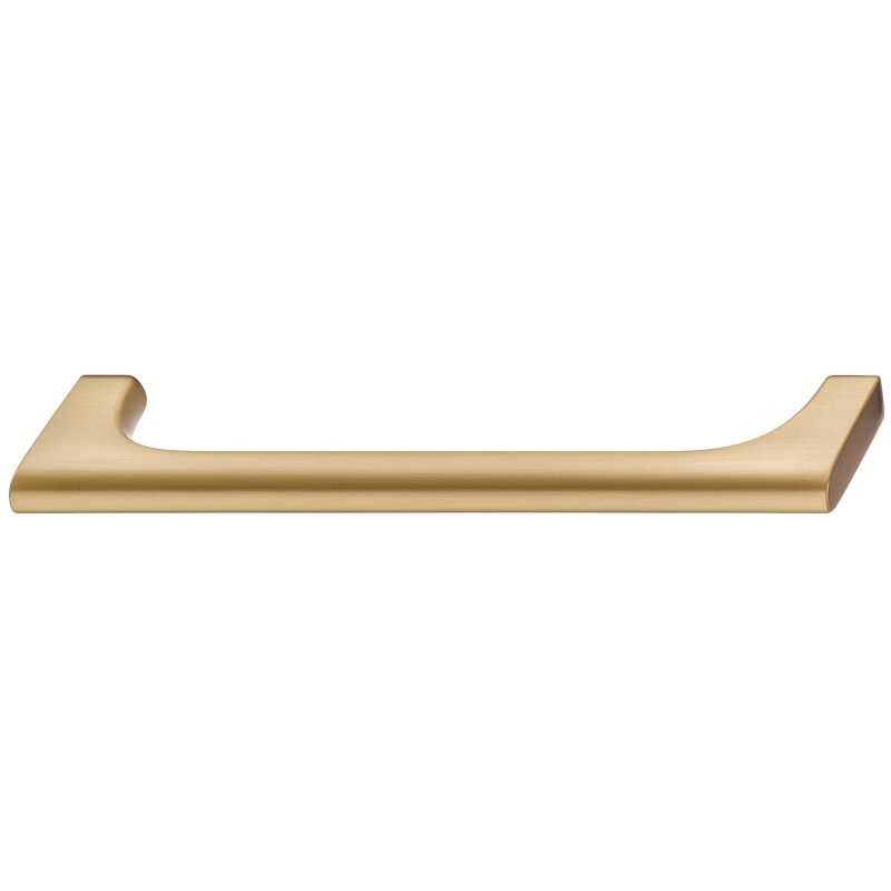 Dette møbelhåndtaket er laget i sinklegering med en børstet gullfarget overflate.